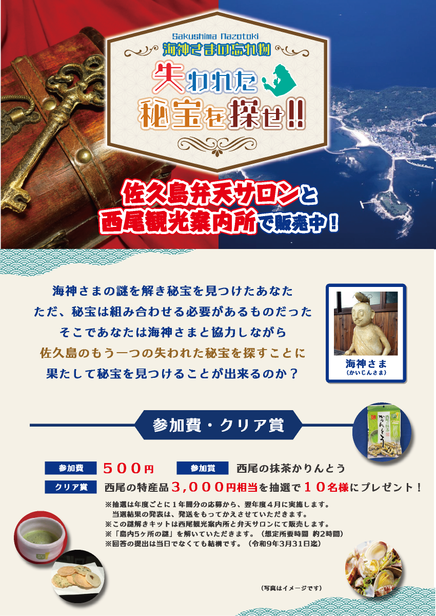 | 備考 | 抽選は年度ごとに1年分の応募から、翌年度4月に実施します。 当選結果の発表は、発送をもってかえさせていただきます。 この謎解きキットは西尾観光案内所と弁天サロンにて配布します。 「島内5か所の謎」を解いていただきます。(想定所要時間 約2時間) 回答の提出は当日でなくとも結構です。 |